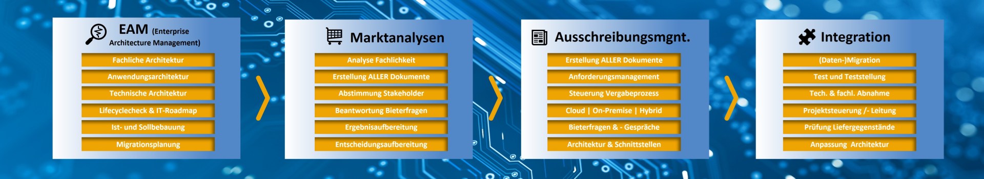 Wenn IT-Anwendungen beschafft werden, ist es sinnvoll, die Enterprise-Architektur zu analysieren und vorher genau zu prüfen, was der Markt anbietet, um die richtigen IT-Anforderungen zu stellen. Die beschaffte Lösung muss sich anschließend nahtlos in die bestehende IT-Landschaft einfügen. Daher muss bereits während der Ausschreibungs- und Beschaffungsprojekte an die technische Integration und (Daten-)Migration gedacht werden.